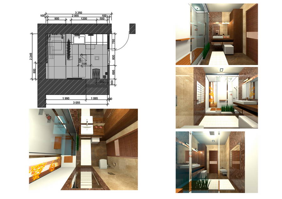 На початковому етапі, дизайнер робить за місцем технічні виміри та пропонує варіанти планування та розташування сантехнічних приладів згідно з технічними умовами. Варіантів може бути кілька, і замовник розглядає в ескізному реченні всі плюси та мінуси майбутнього інтер'єру.